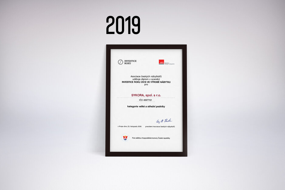Jako jediná nábytkářská firma v České republice se můžeme pochlubit získáním prestižního ocenění Investice roku, které uděluje Asociace českých nábytkářů pod záštitou Hospodářské komory České republiky. Na tyto ocenění jsme patřičně hrdí.