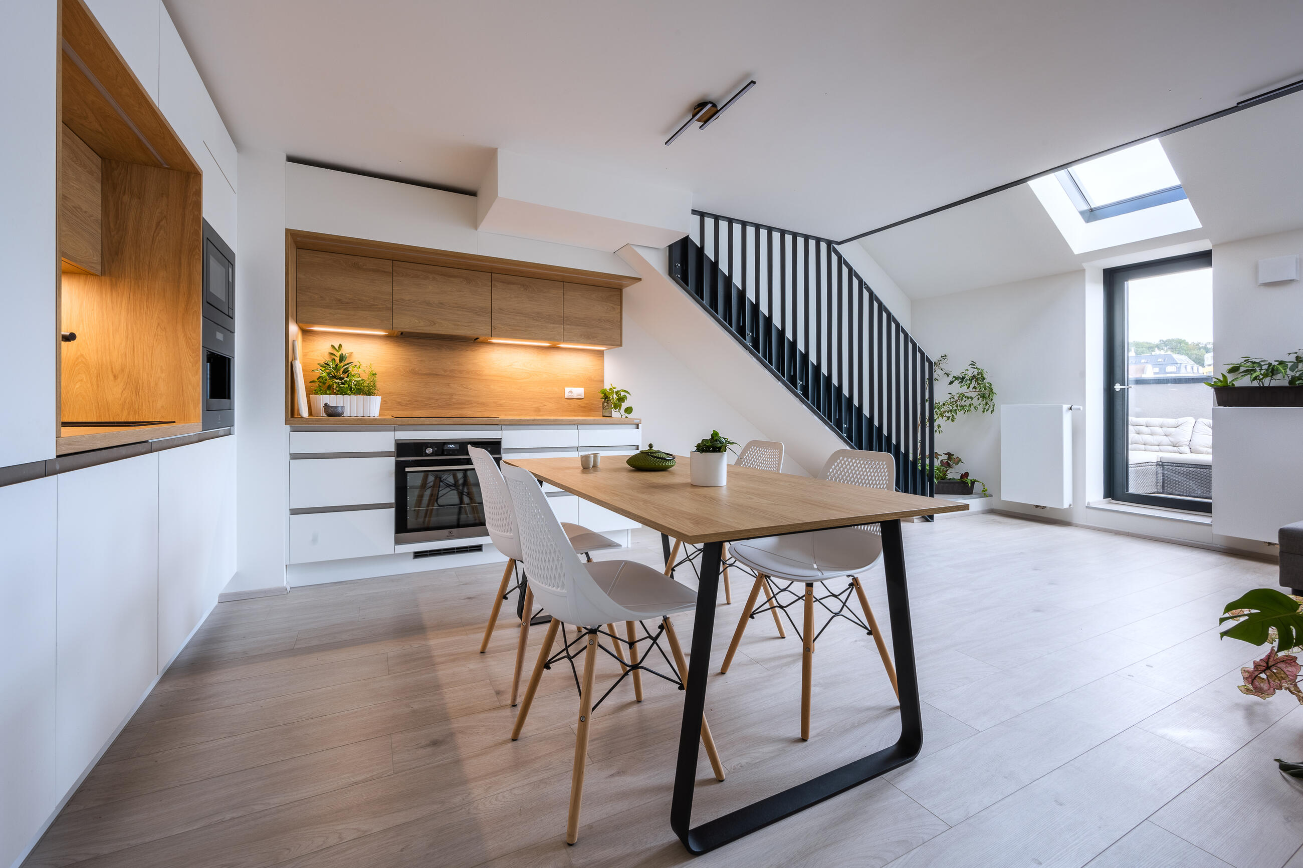 Atypické umístění sestavy pod schody do výklenku si vyžádalo speciální šikminové řešení skříněk. Designový ráz bytu určilo černé kovové schodiště mezi jednotlivými patry. Tuhle vizuální jedinečnost jsme se snažili přenést i do kuchyňské sestavy. Kromě bílé nechybí bezpočet černých prvků - nápaditě i prakticky navržených tak, aby ladily s celkovým vyzněním a zároveň podpořily osobitost každého centimetru.
