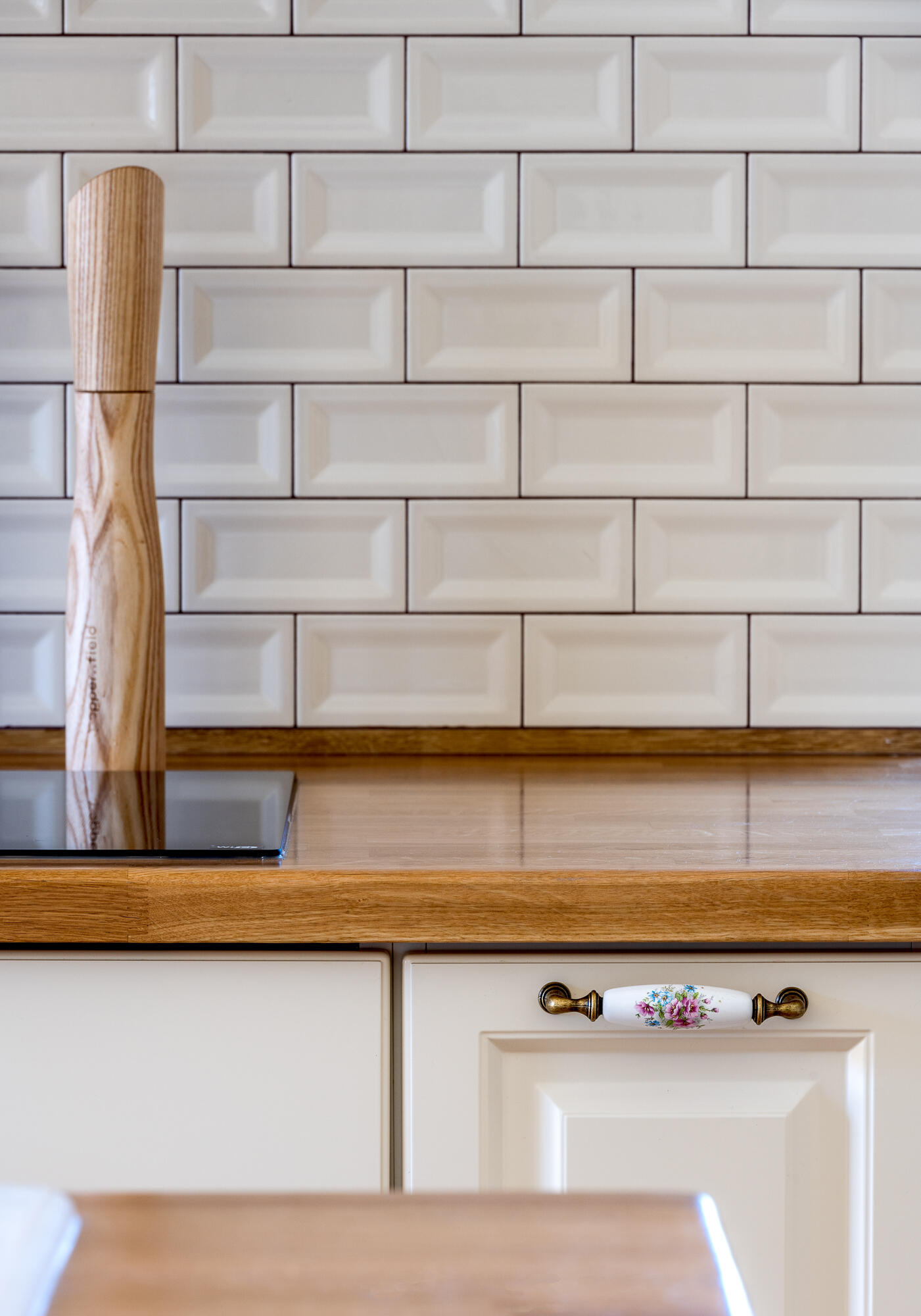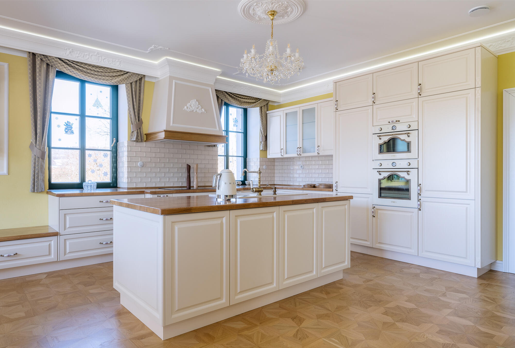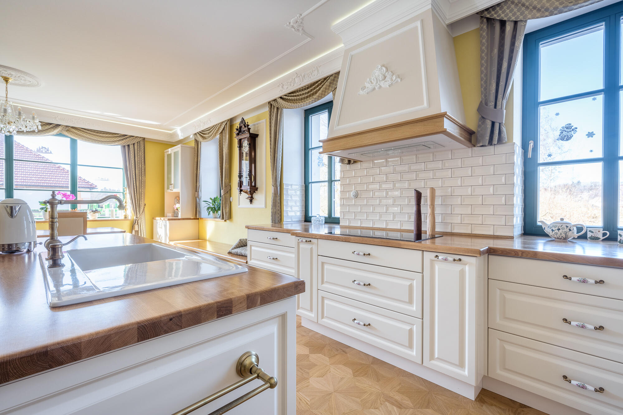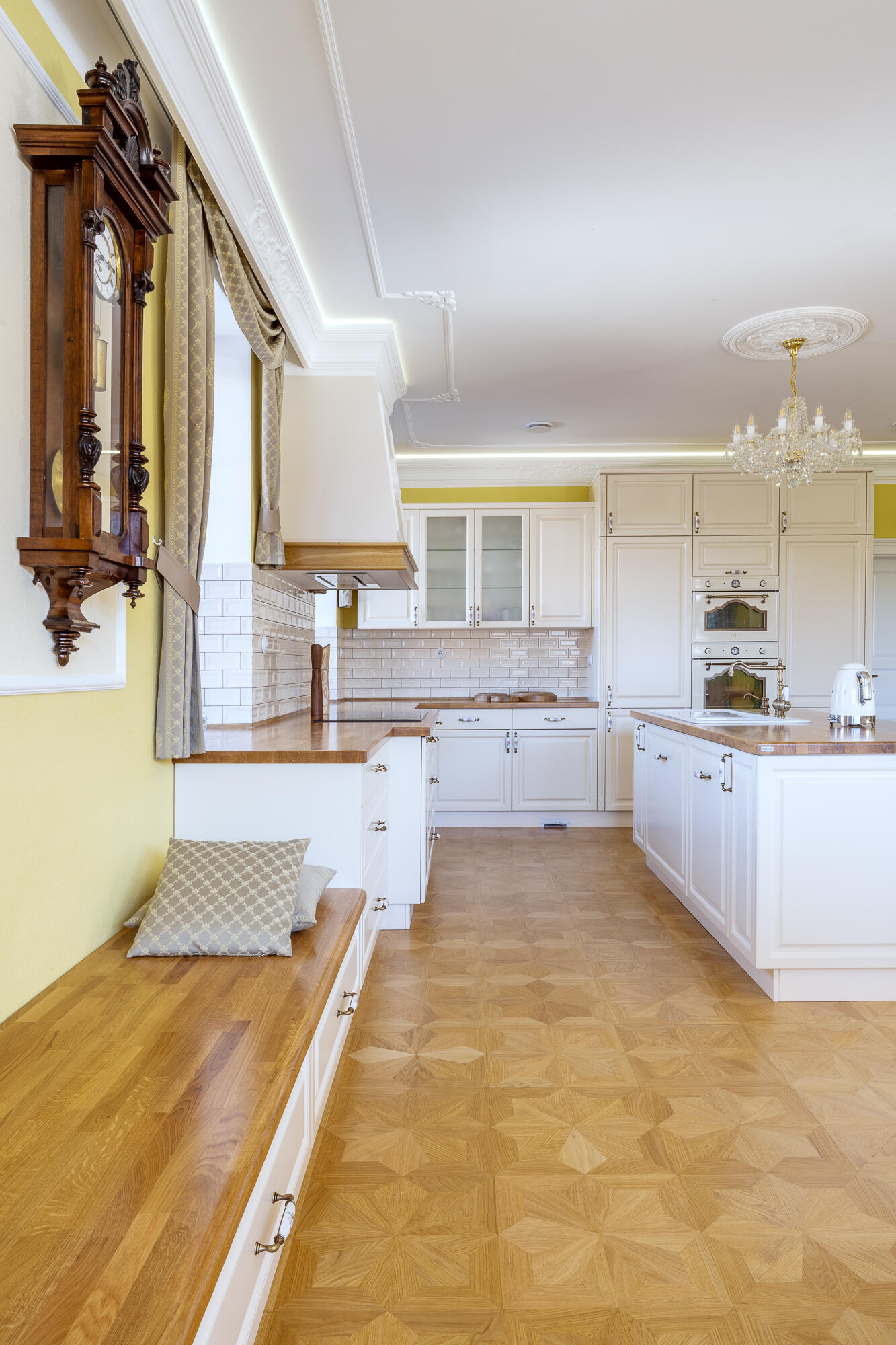 A hatalmas, tágas helyiséget érzékenyen töltöttük meg időtlen berendezéssel és stílusos készülékekkel. A díszített fogantyúkkal ellátott, boríték stílusban profilozott Gant frontok szépsége soha nem kopik meg. A bronzvasalatok, a tölgy munkalap, a benne elhelyezett Franke öntöttvas mosogató és az íves sárgaréz csaptelep ugyancsak az időutazás részei és annak bizonyítékai, hogy bizonyos dolgok soha nem mennek ki a divatból. A rusztikus esztétikát tökéletesen képviseli a masszív fali páraelszívó és a középső ablak alatti pad is, amely pihenő- és tárolóhelyet is kínál. A kakukkos óra, a pazar, aranyozott csillárok és a csempeburkolat a részletek átgondolt kidolgozásáról tanúskodnak.