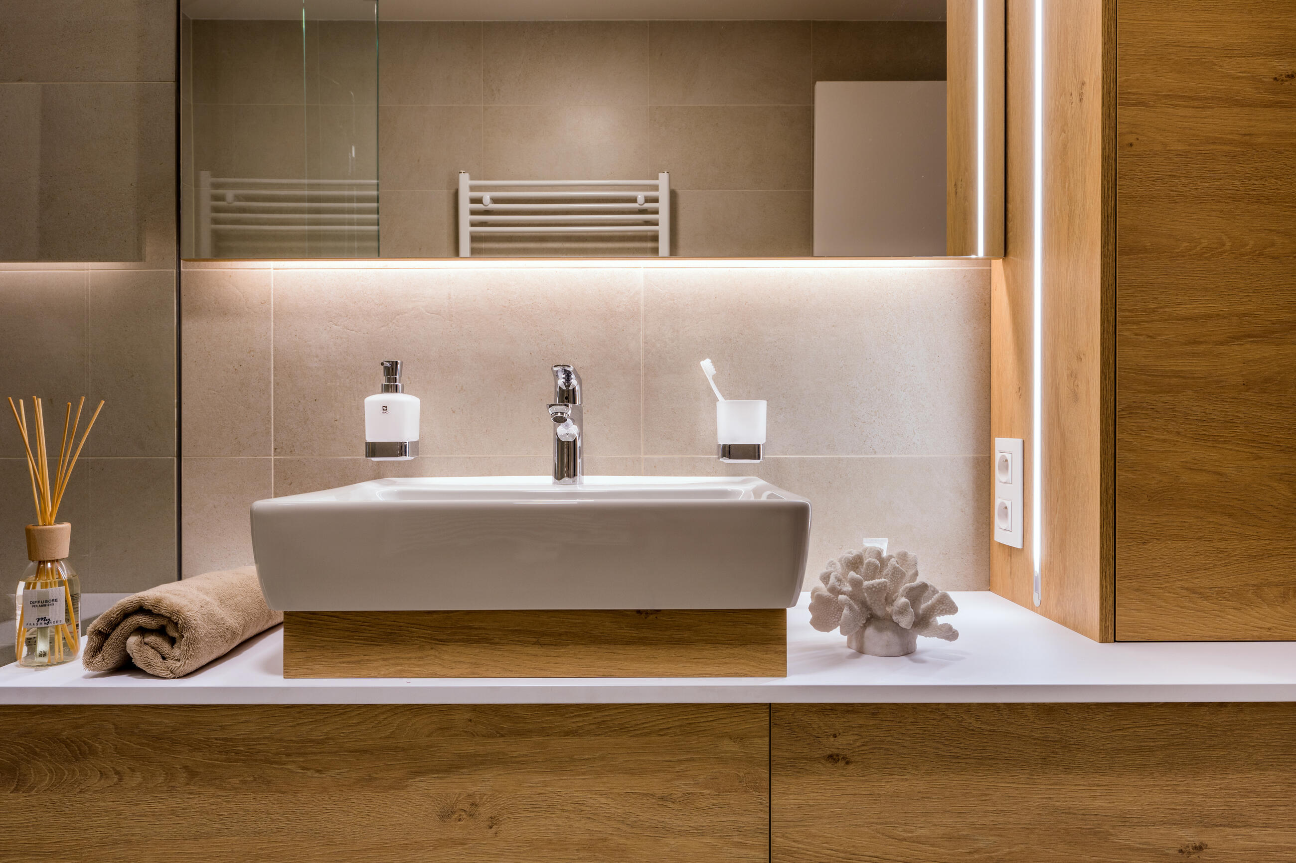 A fürdőszoba bézsszínéhez meghittséget sugárzó Creative stone tölgy társul. A fogantyú nélküli szekrények letisztult, zavartalan hatást keltenek.