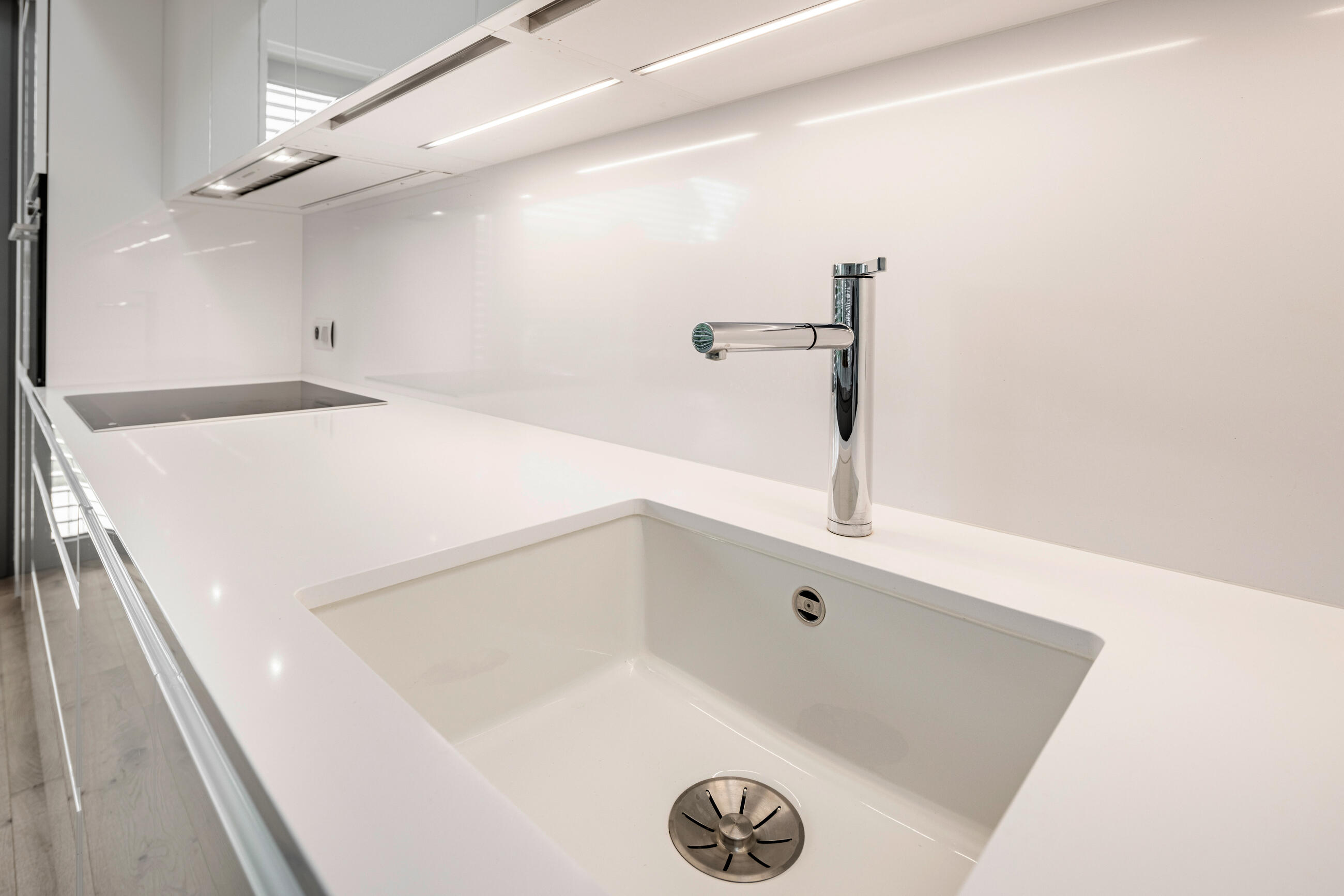 A fehér kerámiamosogató egyszerűen karbantartható. A munkalapba integrált megoldásnak köszönhetően nincsenek illesztések, ami megkönnyíti a tisztítást. A konyha ennek köszönhetően tiszta, rendezett hatást kelt. A mosogató felett formatervezett Blanco perlátoros csaptelep ékeskedik.